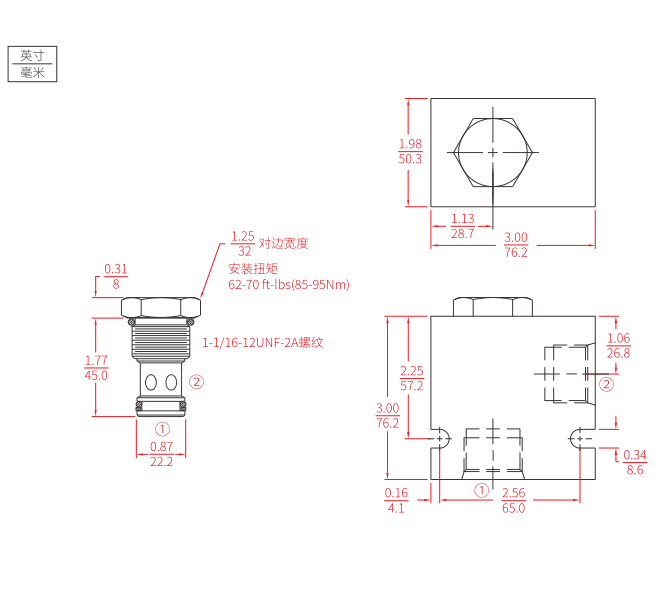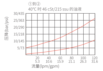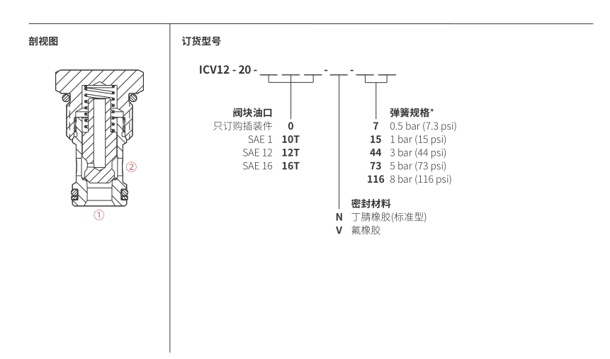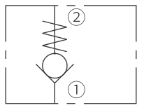 允许油液由①流向②,同时截止油液反向流动。全导向阀芯在复位弹簧压力的作用下关闭阀口直到①处压力足够大时打开②。