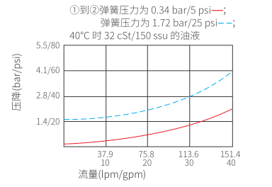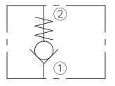 允许油液从 ① 流向 ②,同时截止油液反向流动。全导向阀芯在复位弹簧压力的作用下关闭阀口,直到 ① 处压力足够大时打开 ②。