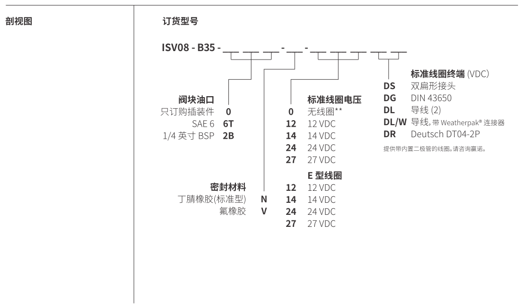 电磁驱动,二位三通,高压滑阀式,液压螺纹插装阀。主要用于执行器的流向控制。