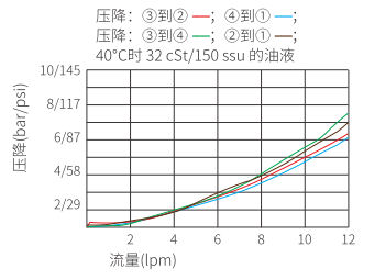 断电时,允许油液从 ③ 流向 ② ,从 ④ 流向 ① ;通电后,阀芯移动,允许油液从 ③ 流向 ④ ,从 ② 流向 ① 。