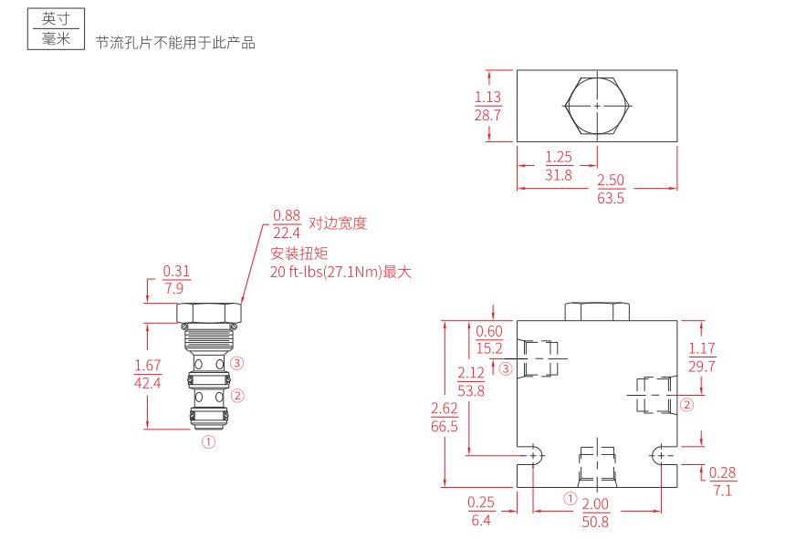 允许油液从较高压力油口 ① 或 ③ 流向油口 ②。该阀通常用来指引油液从双向液压马达的高压端流到压力释放液压制动器。