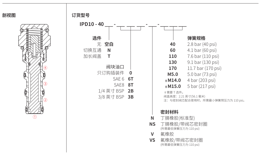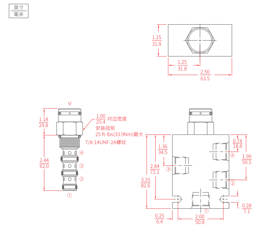 在初始位置 ( 无液控 ) 时,允许油液从 ③ 向 ② 双向流动,而在 ④ 处截止。V 是可通大气的弹簧腔,该腔采用 〇 型圈密封内部油道,防止油液流入该腔。当远端信号到达 ①时,阀芯移动,③ 流向 ④ 接通,而 ② 处闭合。由于采用带泄油孔的弹簧室,因此可以在任何油口对插件完全加压,而不会影响所需的液控压力。